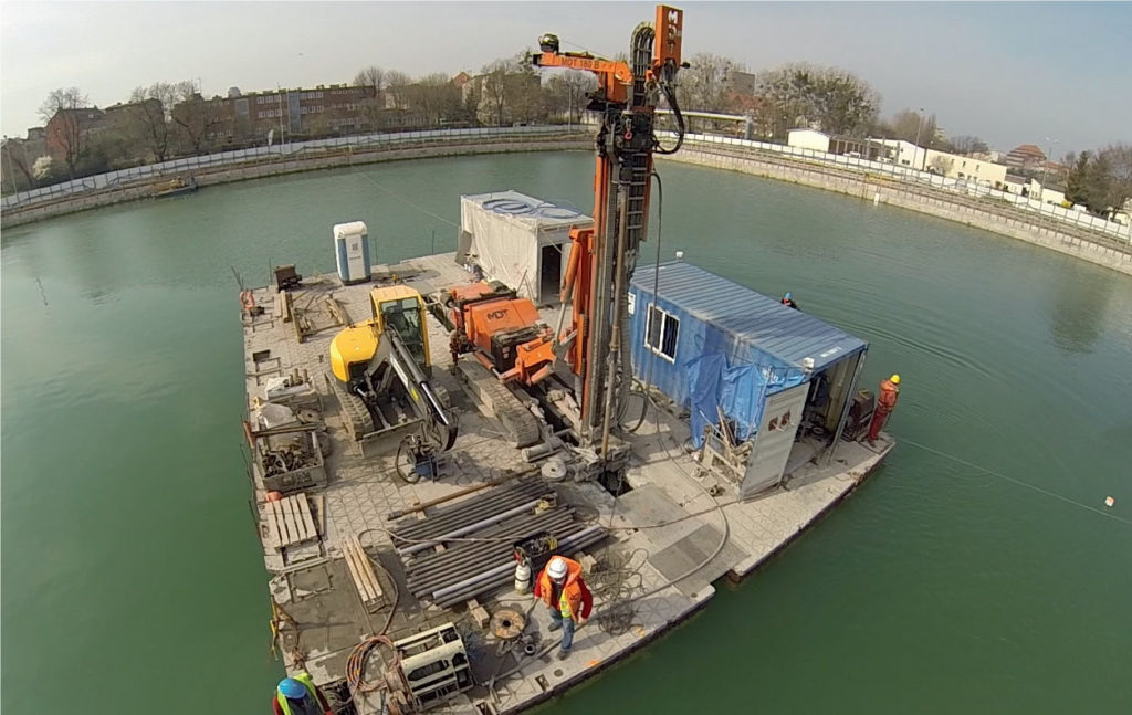 The works were driven from the water surface with the entire construction facilities and drilling rig located on floating platforms. In order to ensure proper efficiency, a special procedure was developed for the installation of micropiles, with the use of a connector developed especially for this task, the so-called shell joint. It is a kind of split connector, which made the divers to easily unfasten the joint in order to release the two hollow bars fastened with it. After the release, dead passage column could be used as the beginning of the working column of another micropile (without dismantle) after the diver screwed the drilling bit on the last hollow bar remaining in the water.